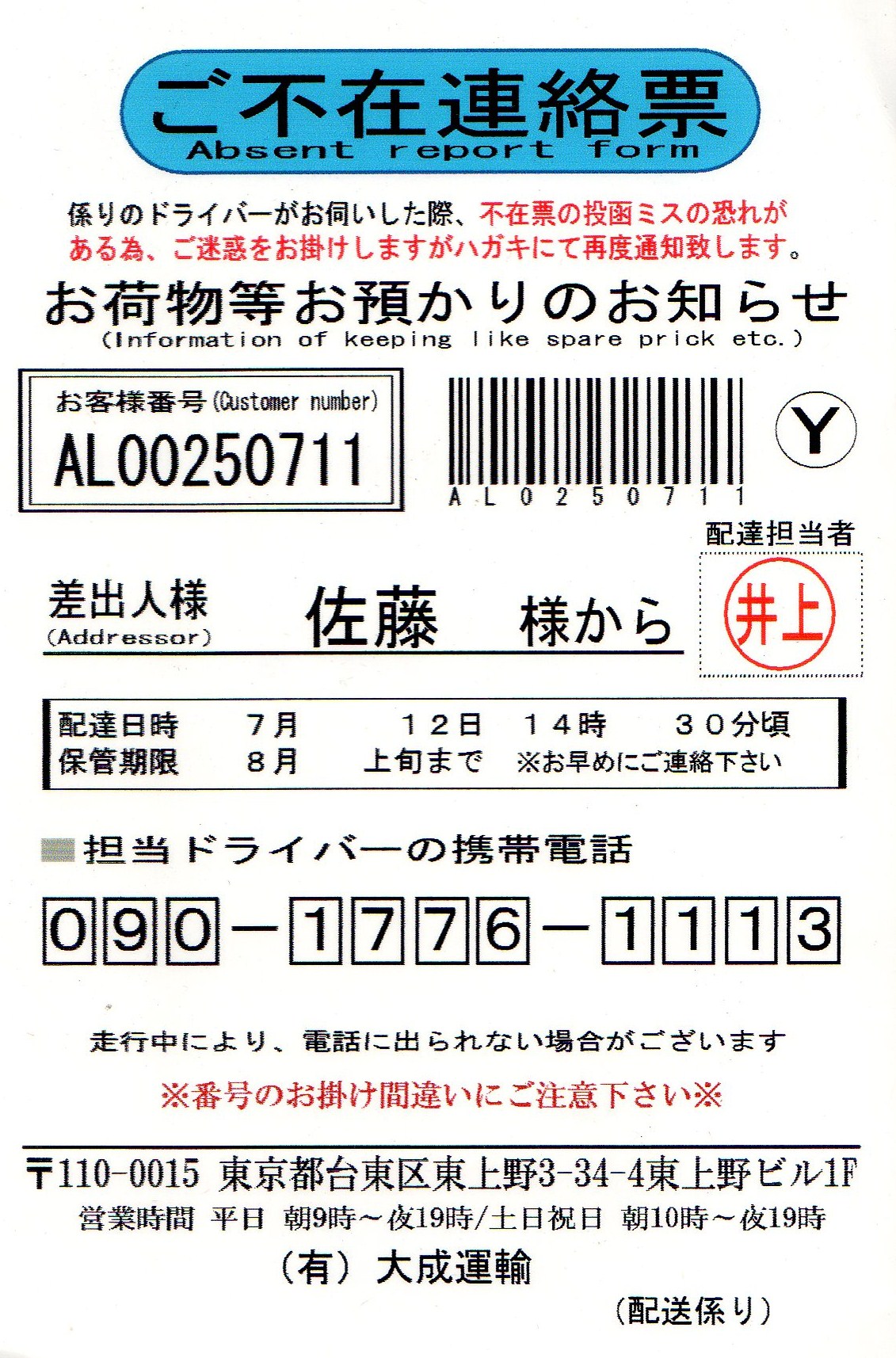 おいさんも運送にかかわっているが、不在連絡表と言うものは、現地で書いてドアや郵便受けに入れるもの。